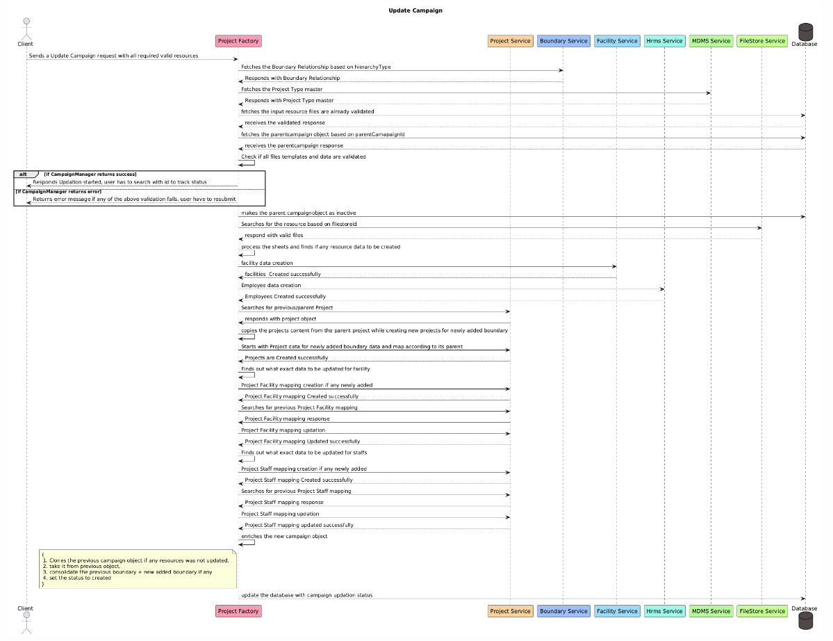 This document outlines the flow for updating an existing campaign using various services in the system. The process involves interactions between multiple services, including the Project Factory, Project Service, Boundary Service, Facility Service, HRMS Service, MDMS Service, FileStore Service, and the database. The update flow ensures that the required resources are validated and updated correctly before finalizing the campaign update.